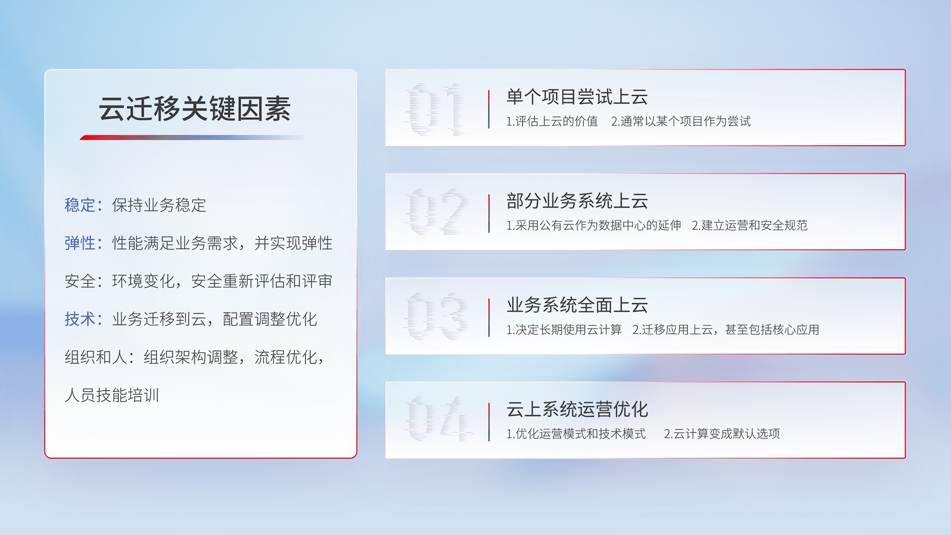结合实际业务,,,从规划设计、、、、云平台选型、、、云原生改造、、、数据迁移、、、集成交付,,,迁移全过程为客户识别最佳上云路径,,,,做好风险识别管理,,,,设计网络架构、、、身份权限、、、、安全审计合规、、、操作审计、、、日志审计、、监控告警策略、、、、多站点容灾设计等,,,对云上基础设施进行整体规划,,提升IT治理水平,,以满足弹性、、、高可用、、高性能的需求。。。。